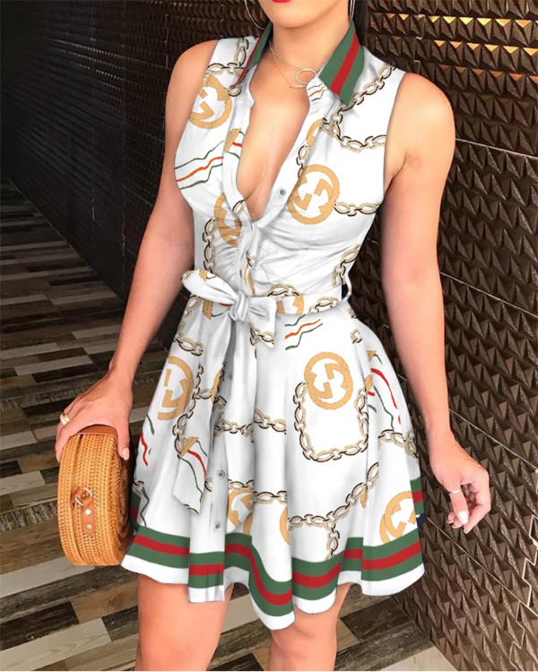 White Sleeveless Chain Print Tie Waist